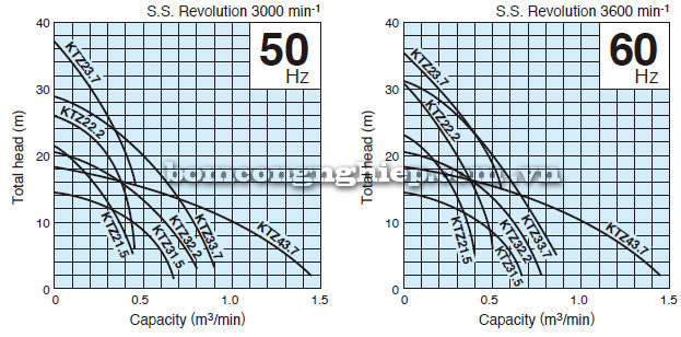 Biểu đồ lưu lượng cột áp của bơm chìm Tsurumi KTZ 22.2