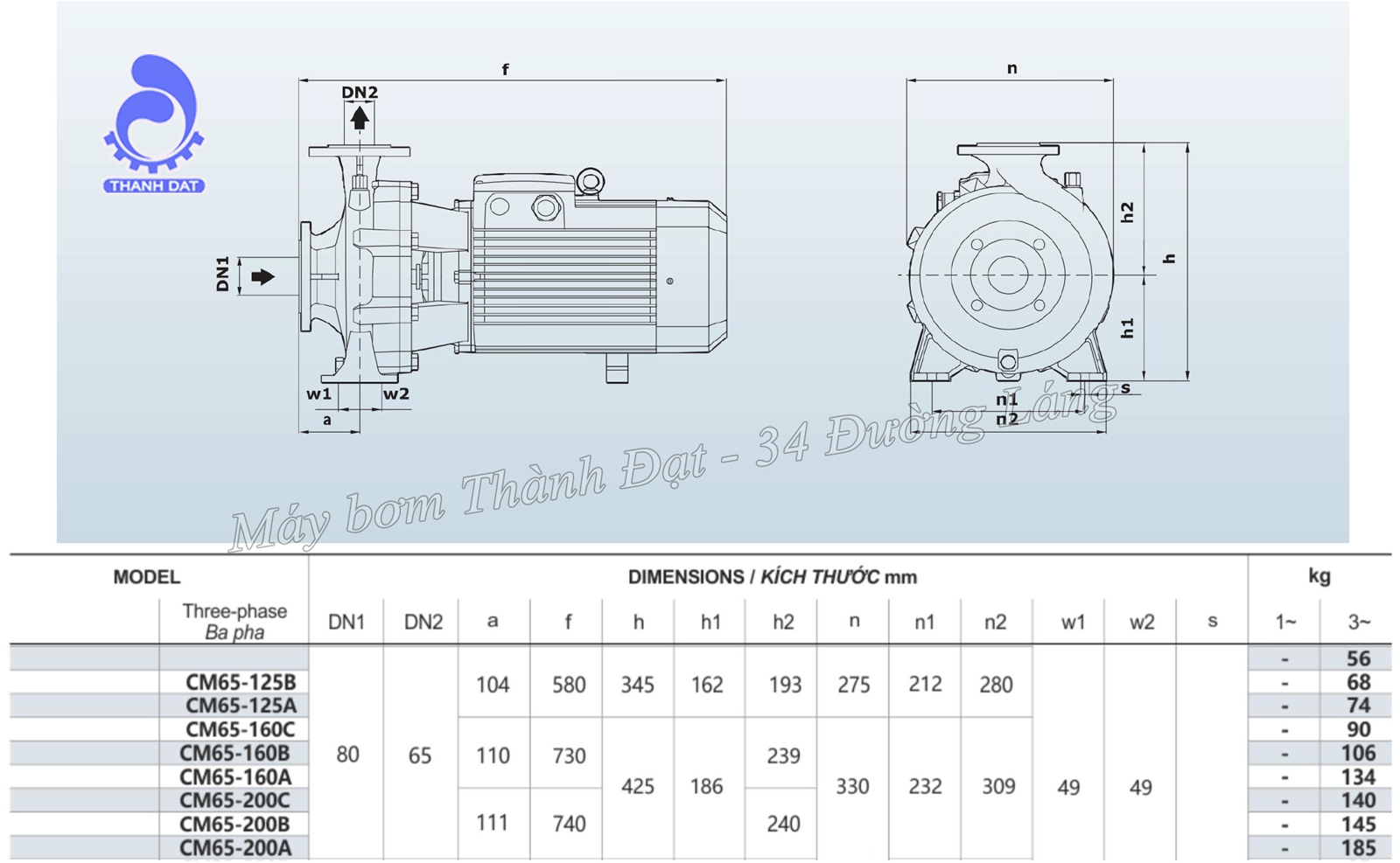 Bảng thông số chi tiết kích thước của máy bơm công nghiệp Inter CM 65-160C