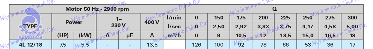 Bảng thông số kỹ thuật máy bơm giếng khoan Pentax 4L 12/18 7.5HP