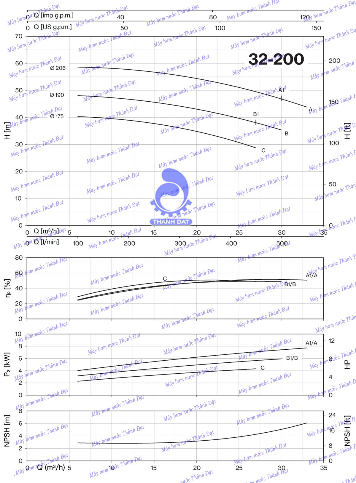 Biểu đồ lưu lượng cột áp của máy bơm nước ly tâm trục rời Pentax CA 32-200B