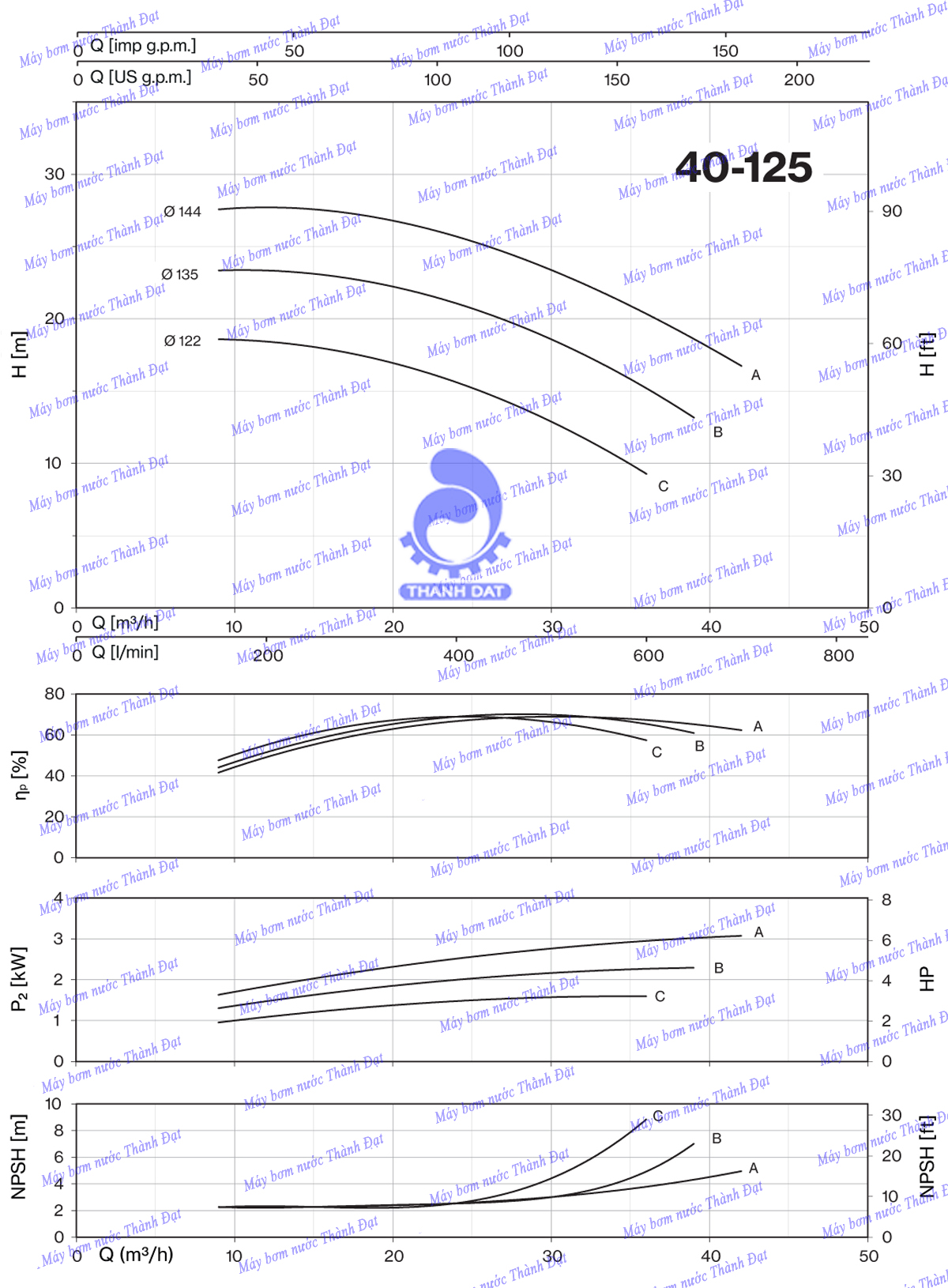 Biểu đồ lưu lượng cột áp của máy bơm nước ly tâm trục rời Pentax CA 40-125C