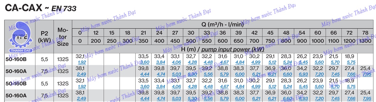 Bảng thông số kỹ thuật chi tiết của máy bơm nước ly tâm trục rời Pentax CA 50-160B